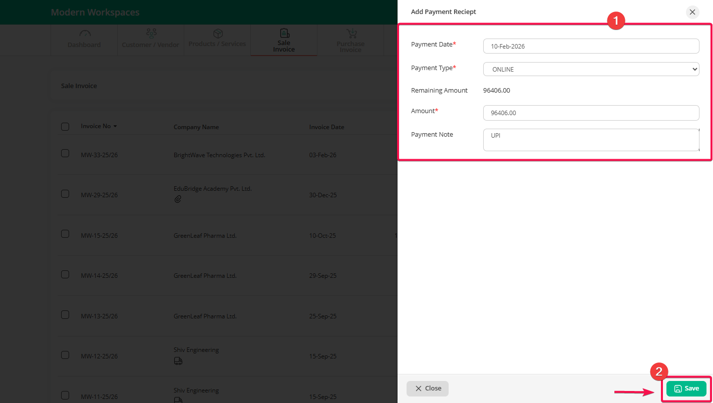 Step 3.6: Click on the “Save” button to complete the payment receipt entry.