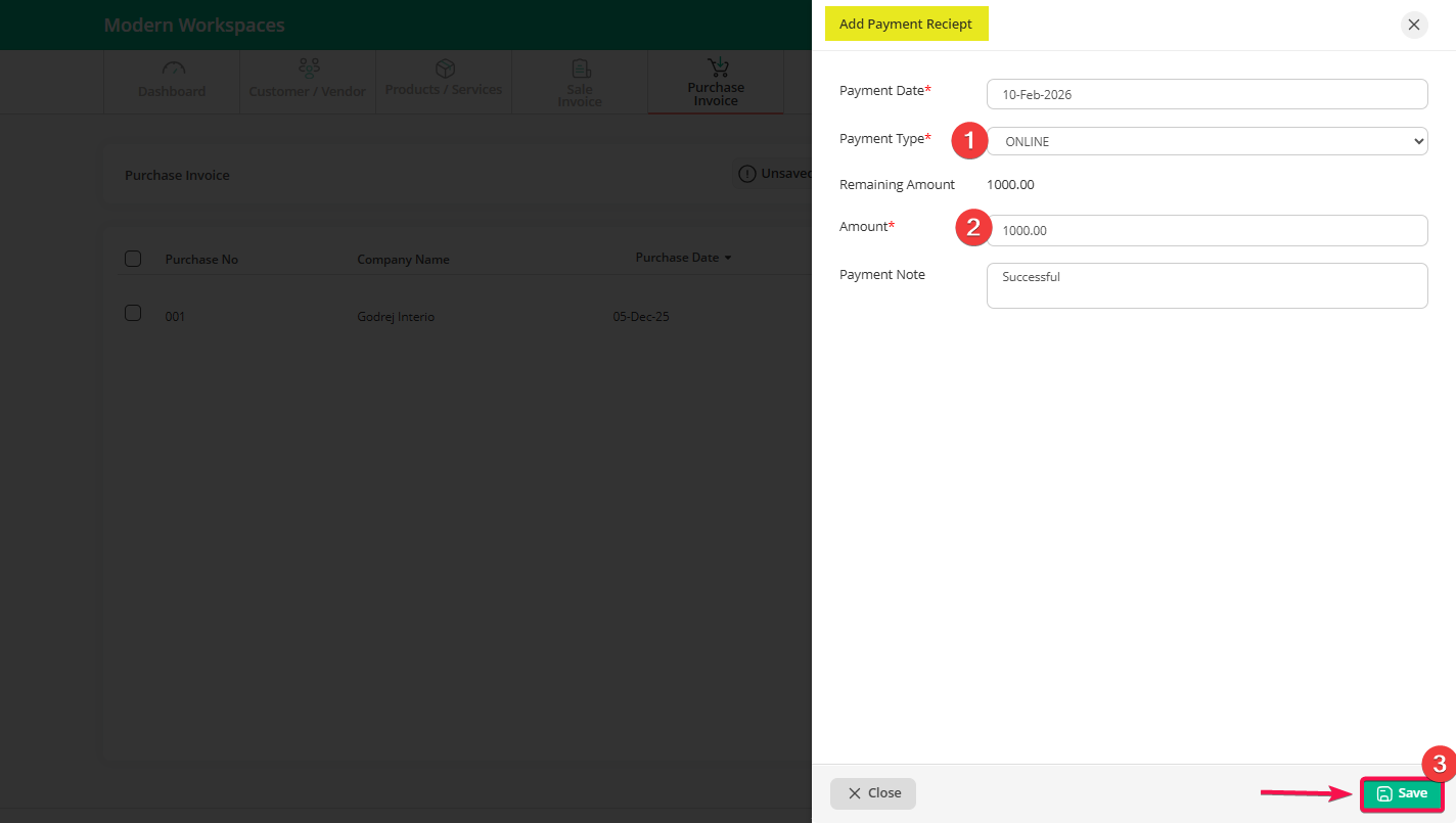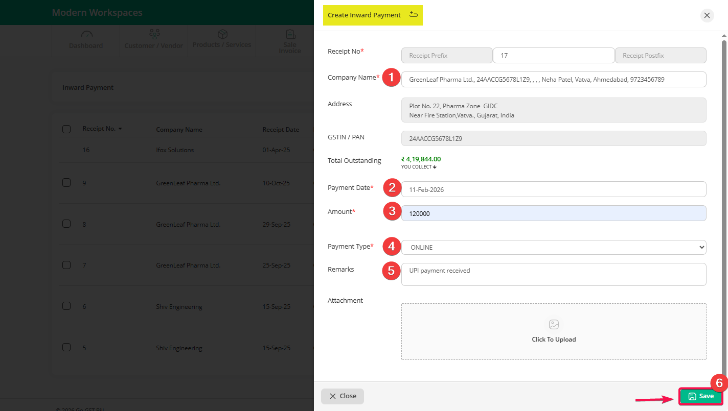 – It will auto create Payment Receipt No (Last payment receipt no + 1)
