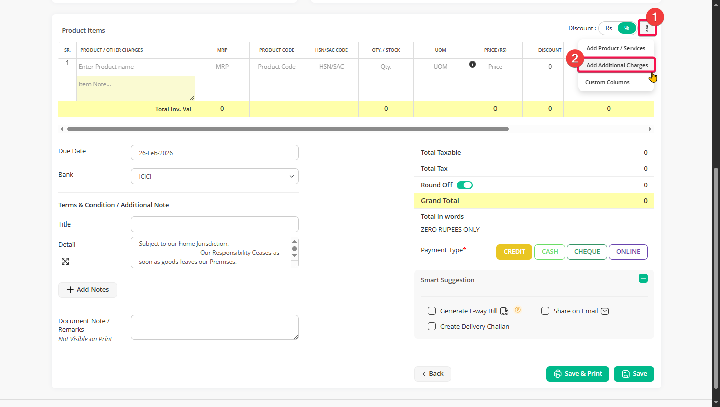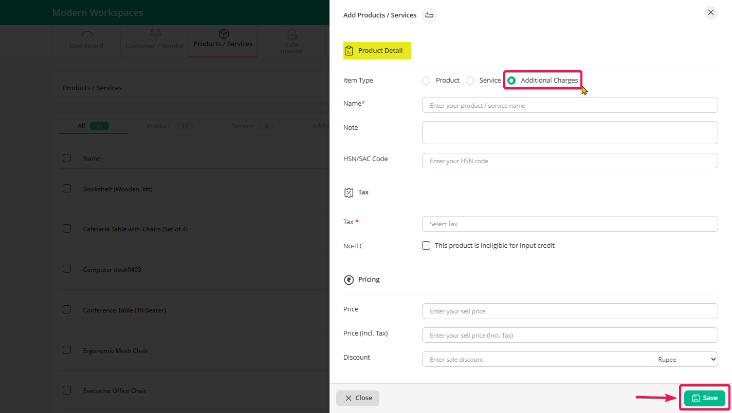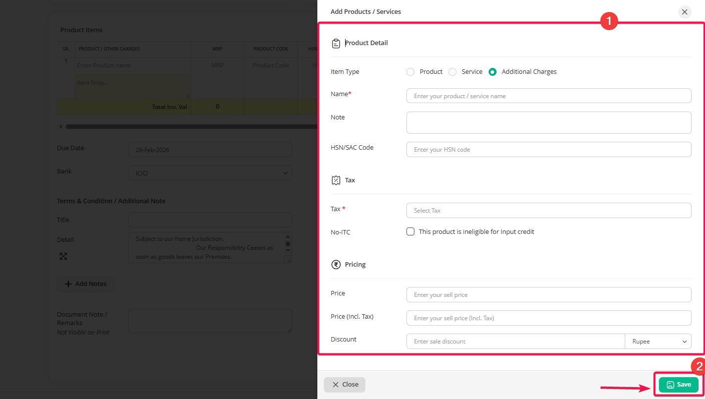 Step 2 : Add the required additional charges such as transport, packaging, loading, or any other extra cost and click “save”.