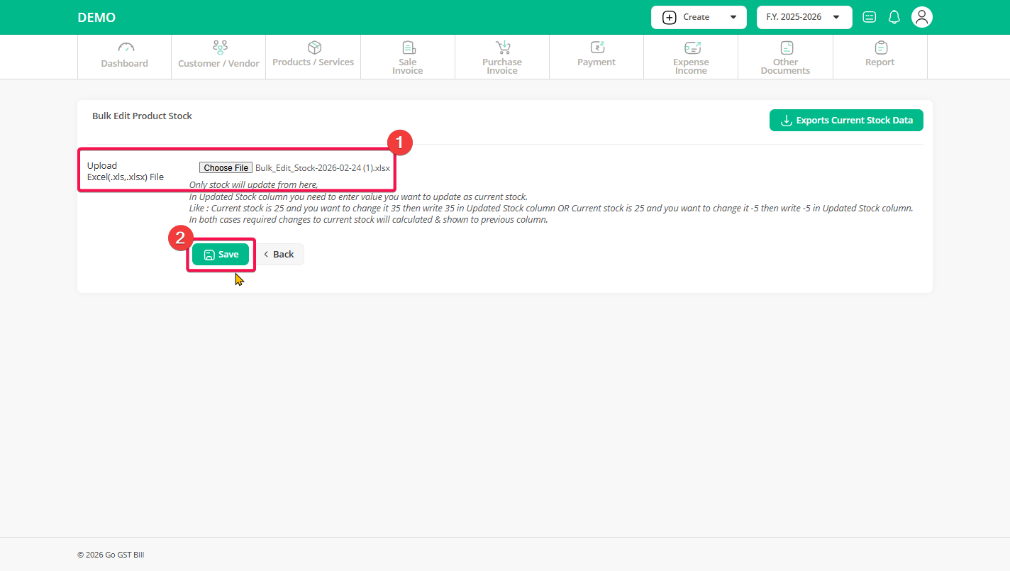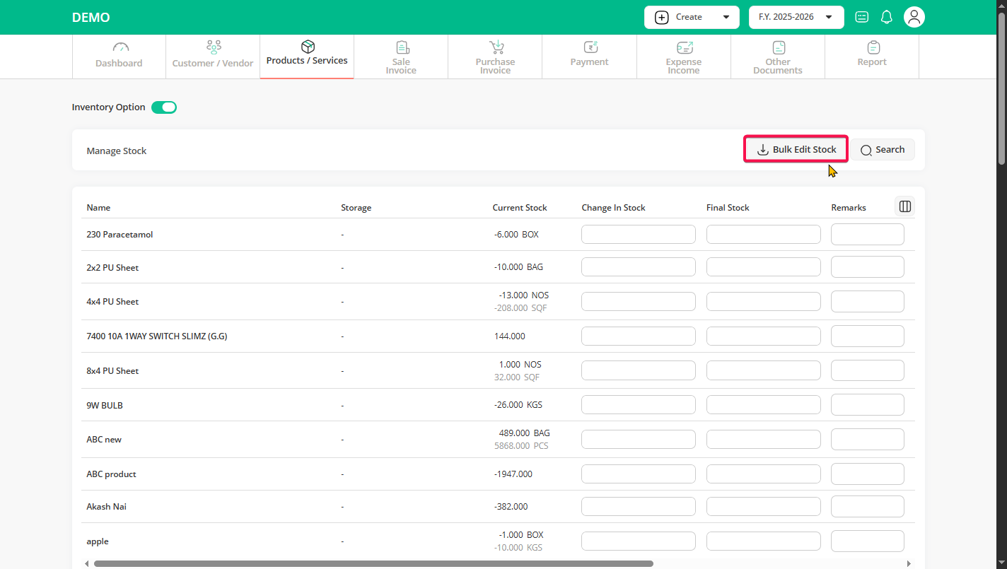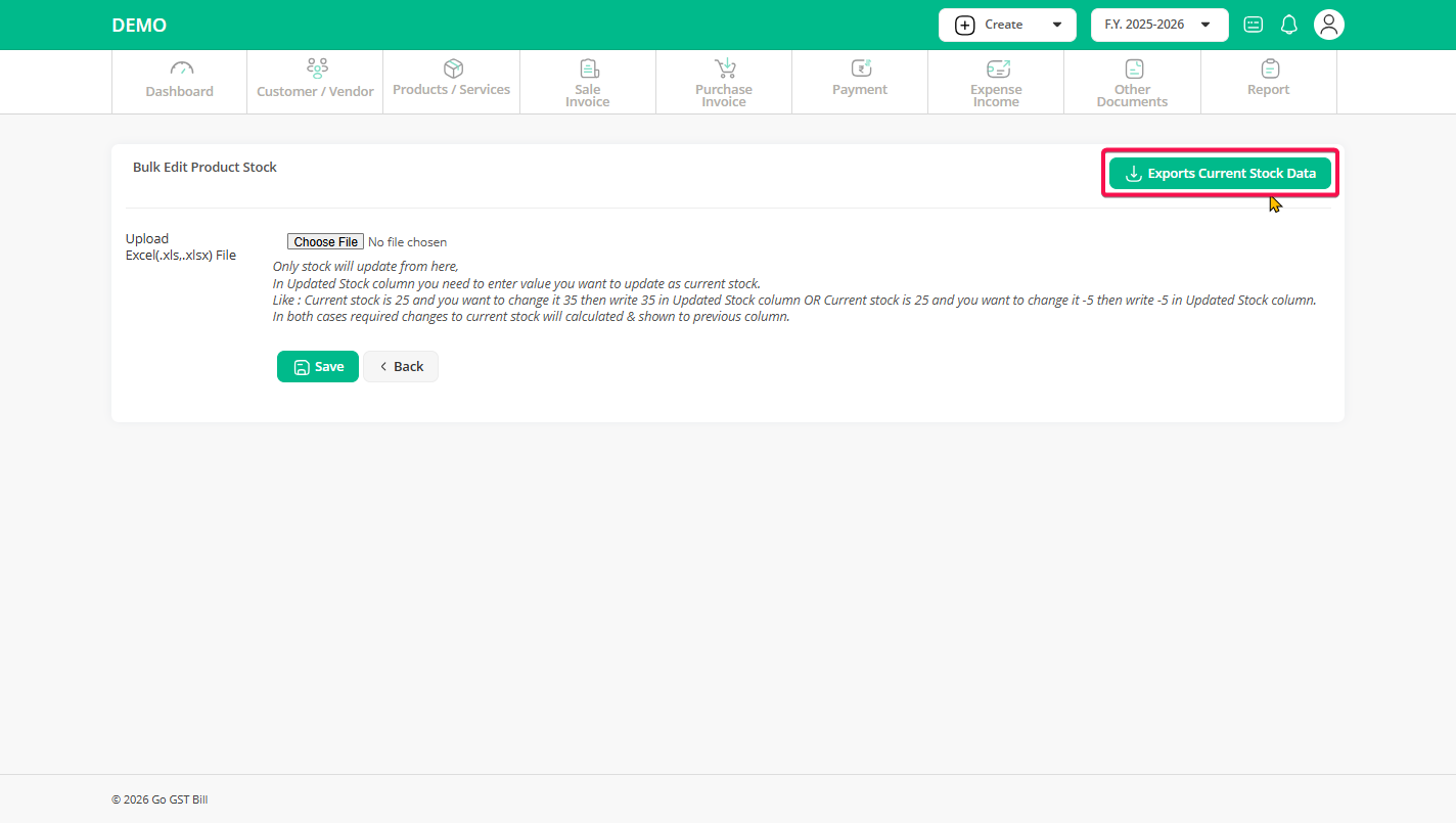 Step 1: Click on the “Product / Services” menu, then click on the “Stock” sub-menu option.