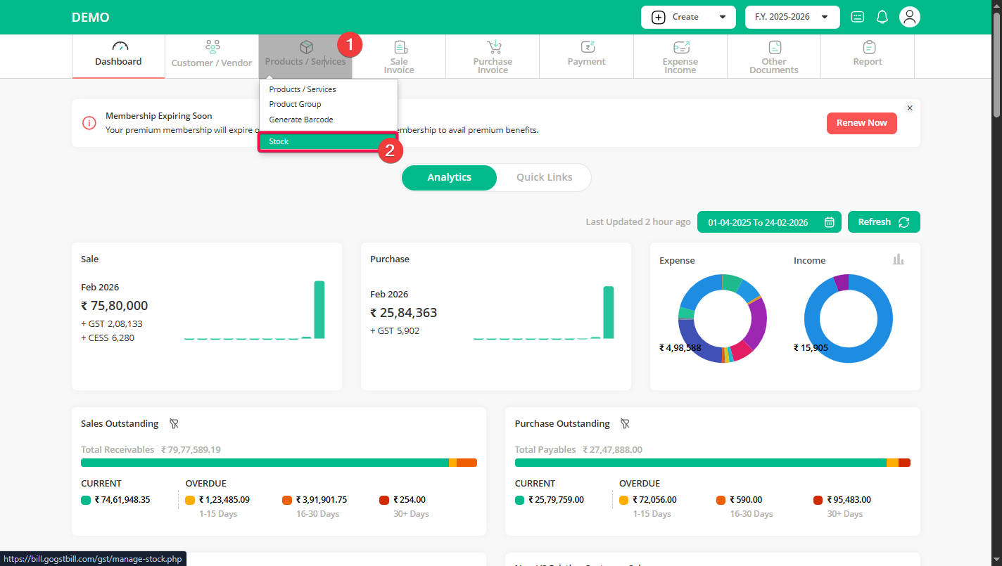 Step 1: Click on the “Product / Services” menu, then click on the “Stock” sub-menu option.