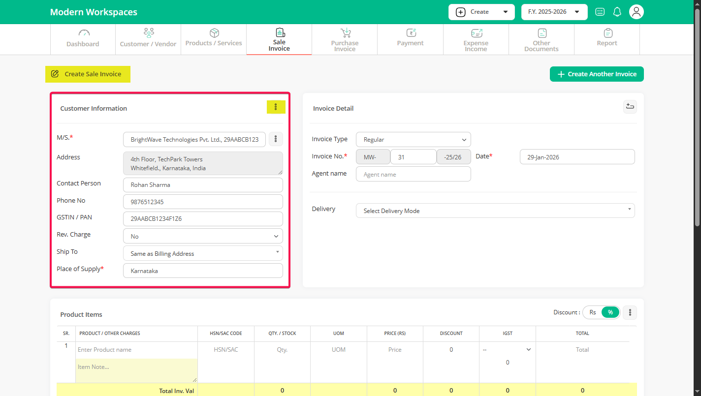 Step 4 : Add products from the list. Details like HSN, quantity, UOM, price, and GST will fill in automatically, so you don’t have to enter everything again. You can still edit them if needed.