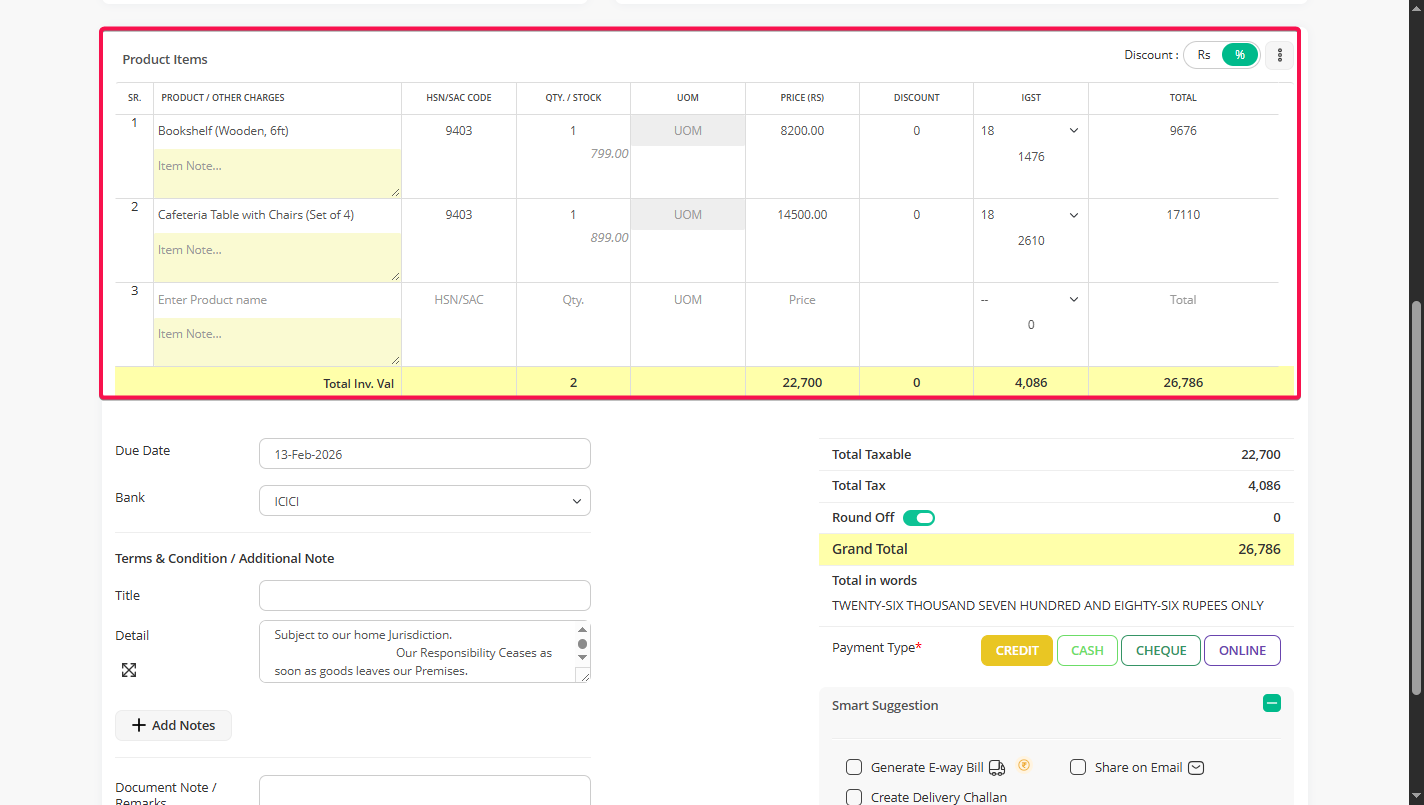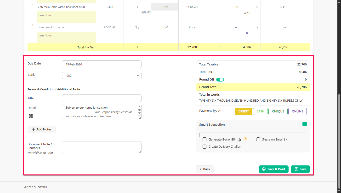 • After checking the total amount, use the round off option to adjust the final invoice value if needed.
