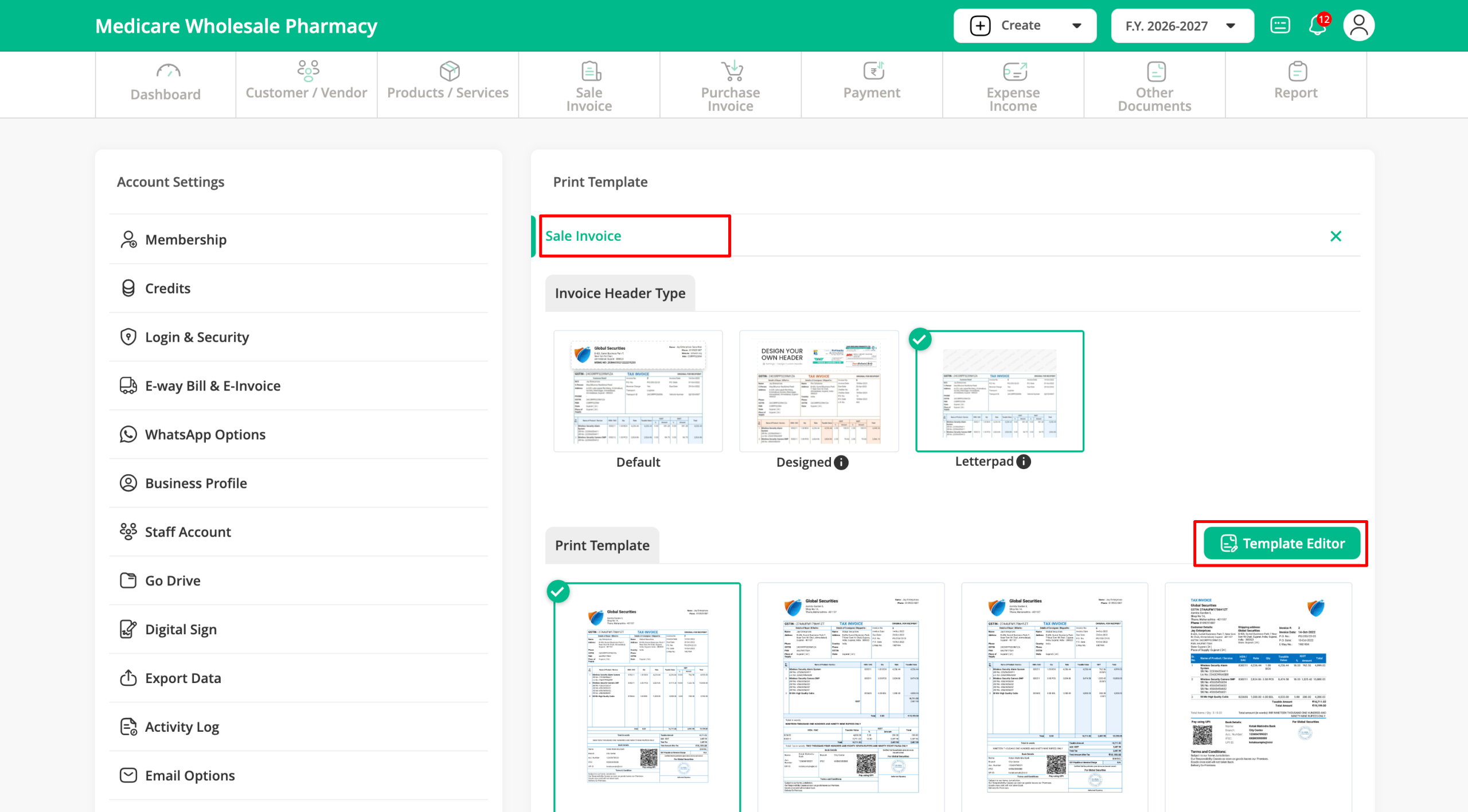 Step 2: Under Application Settings, click on Print Template, then select Template Editor.