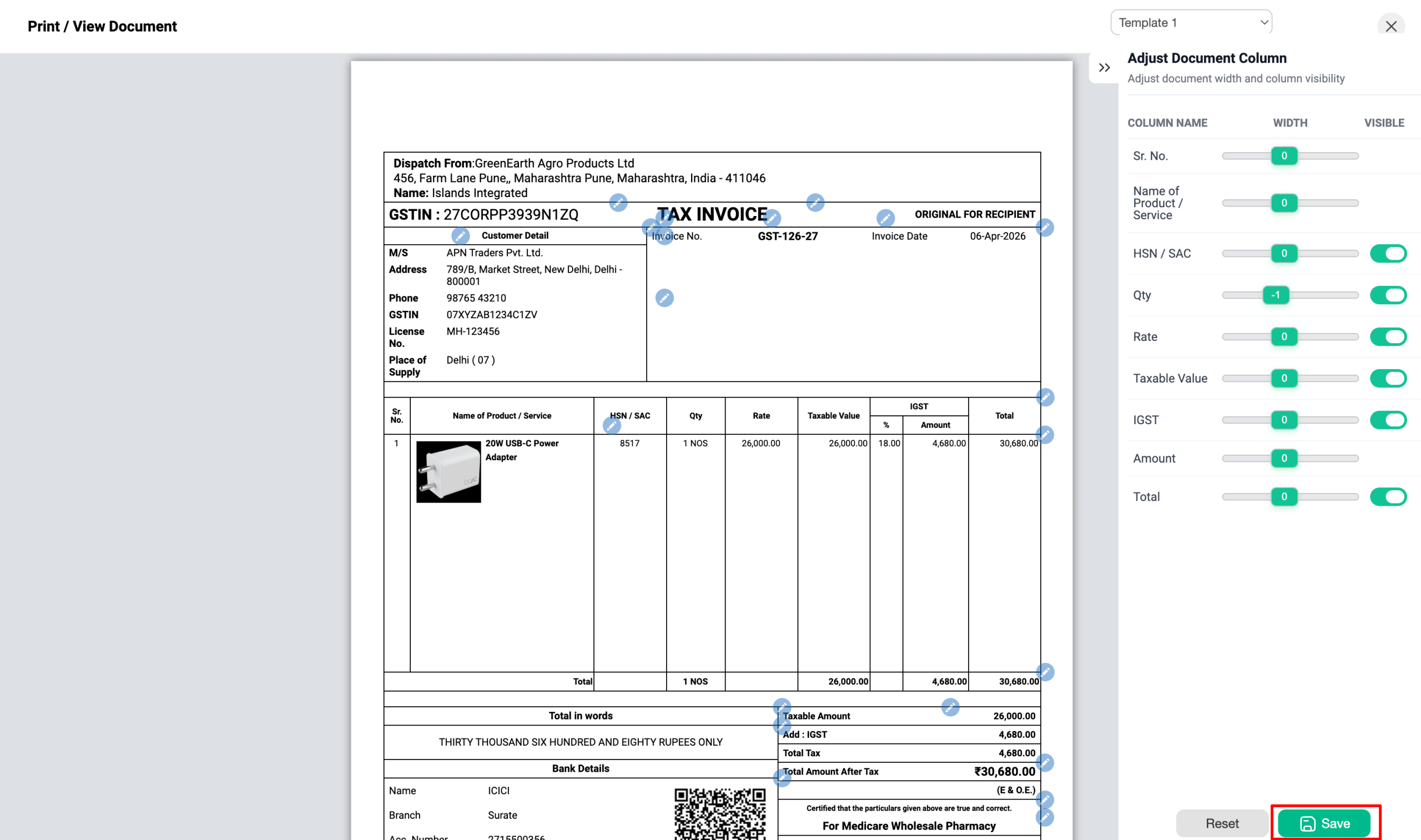 You can also adjust the width of table columns like Sr. No, Product Name, Batch No, HSN/SAC, Qty, Rate, Discount, and Total using the Adjust Table Column option on the right side.