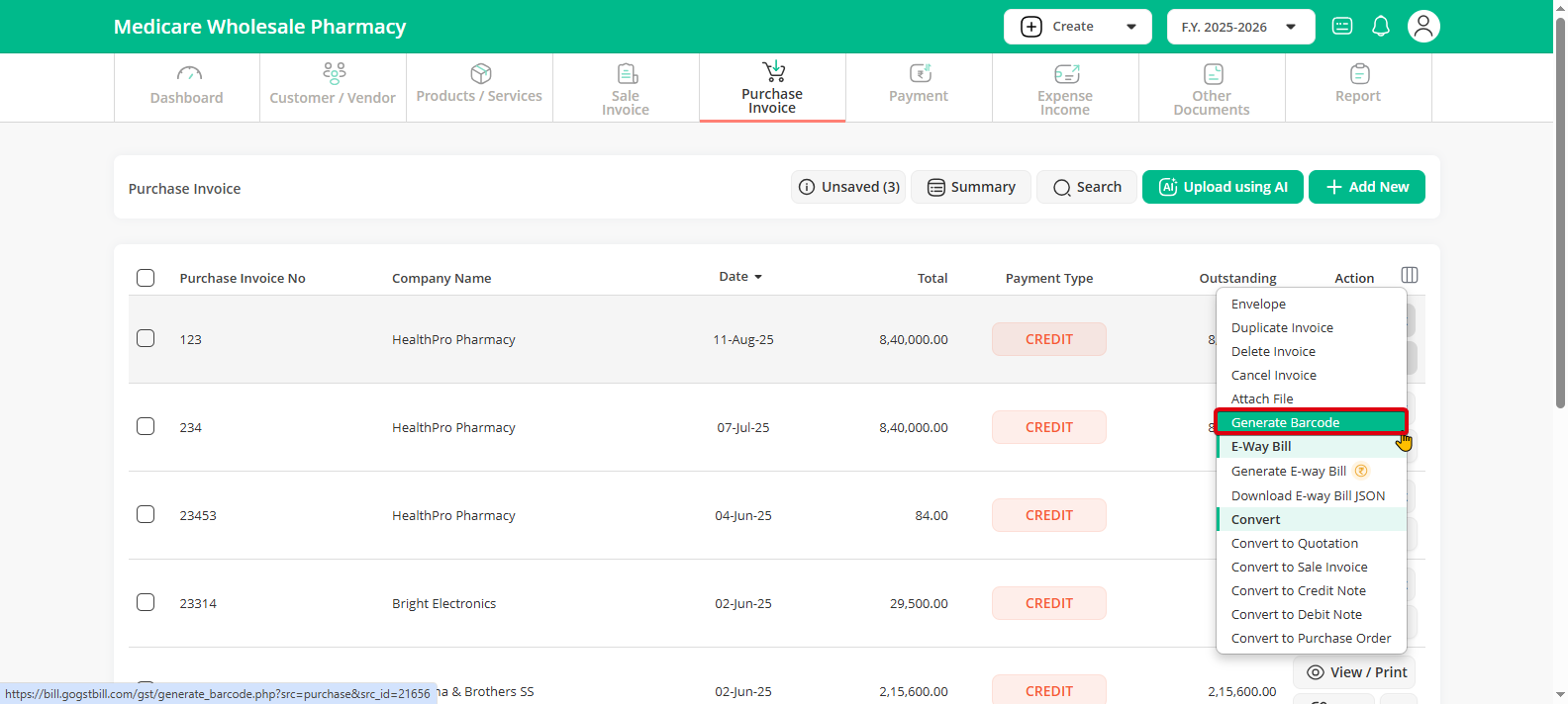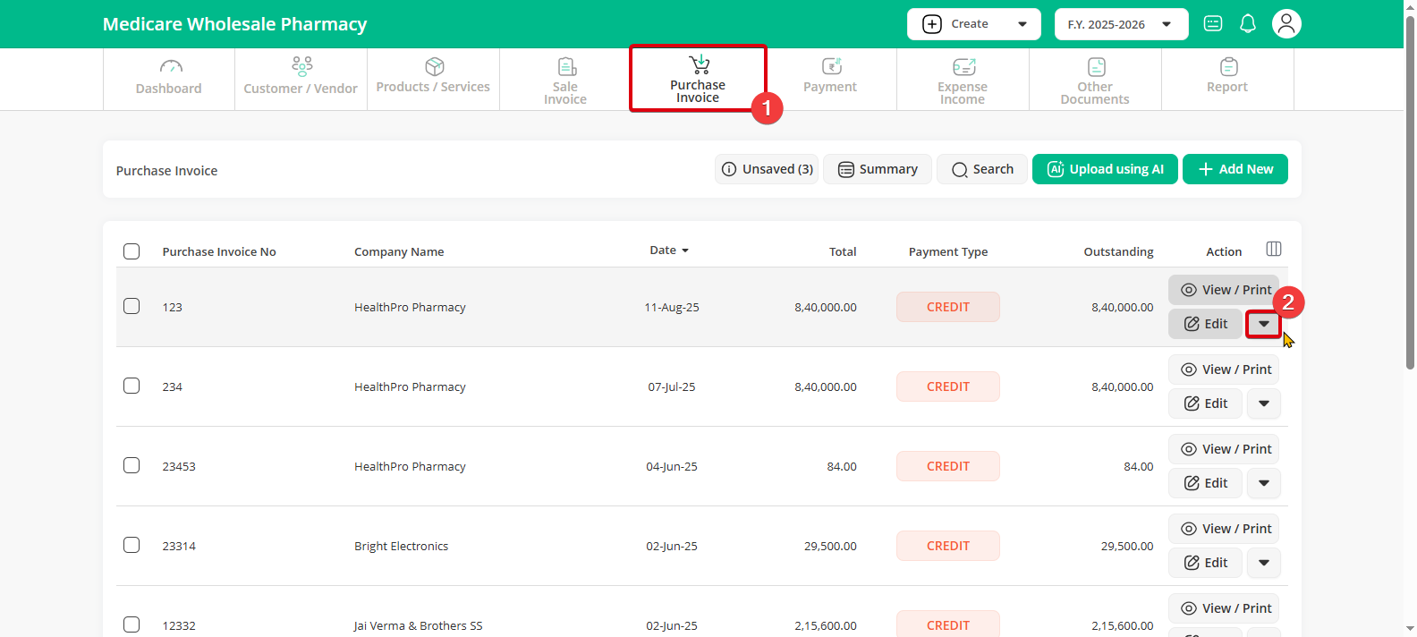 Step 1 : Go to the “Purchase Account” menu and choose the invoice and click on the down arrow button near the “View / Print” button.
