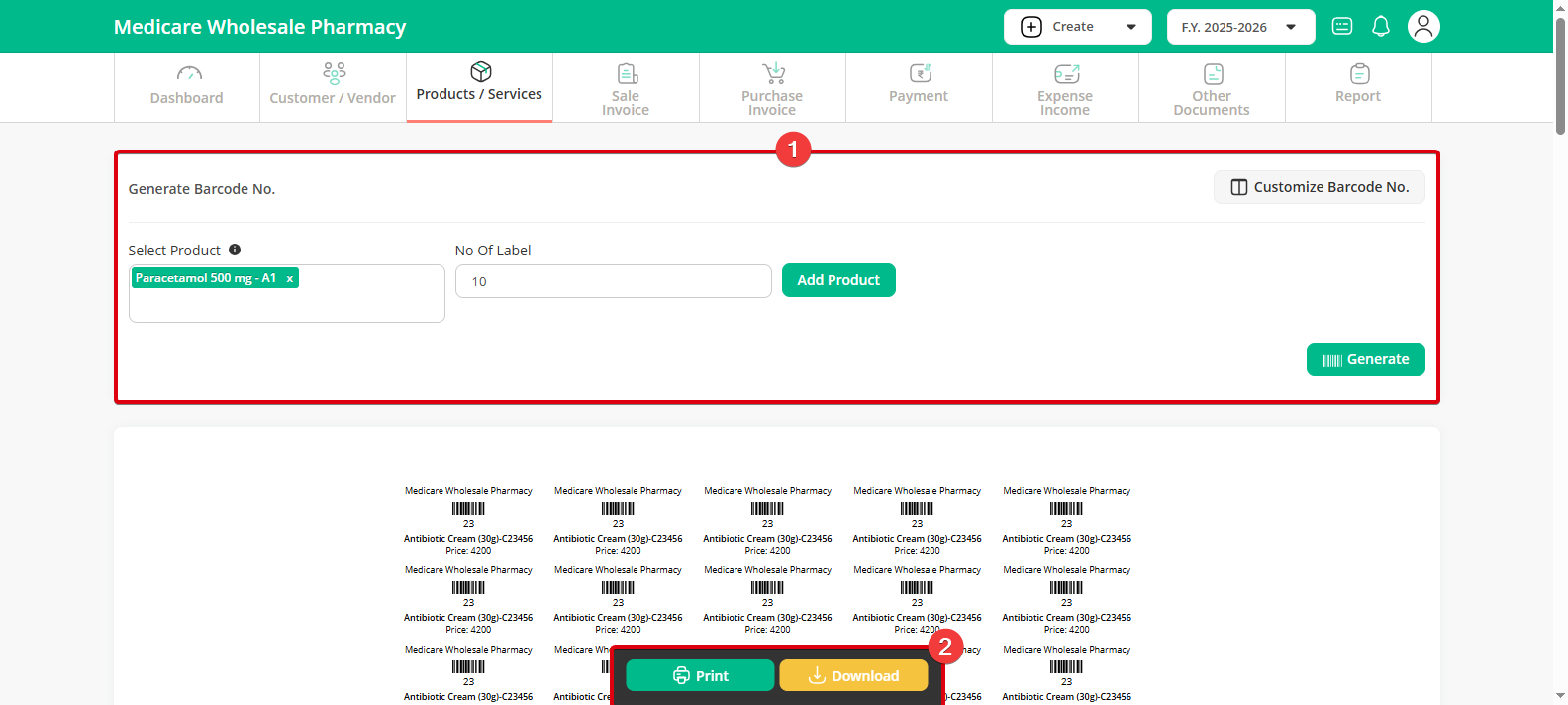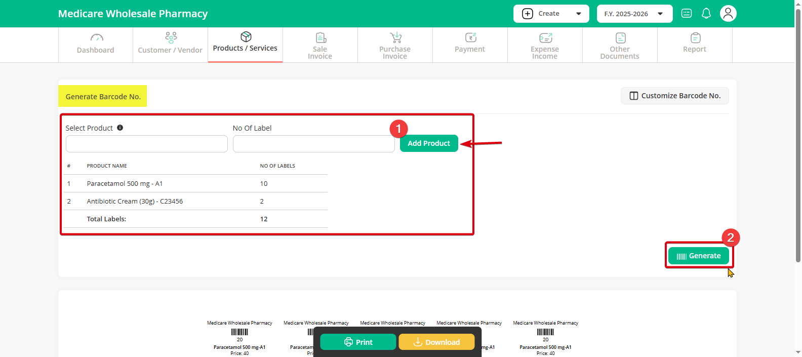 Step 3 : A page will open where you can fill in details like Generate Barcode No., select product, and add label no. You can also Customize Barcode No. if required.