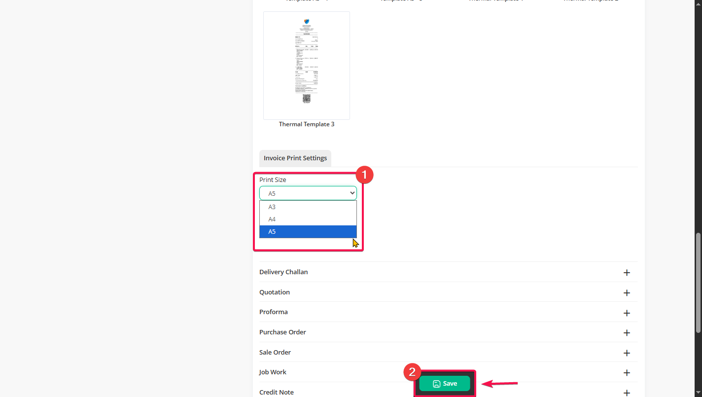 Step 4: Scroll down, select the A5 size to convert the selected template from A4 to A5, and then click on the “Save” button.
