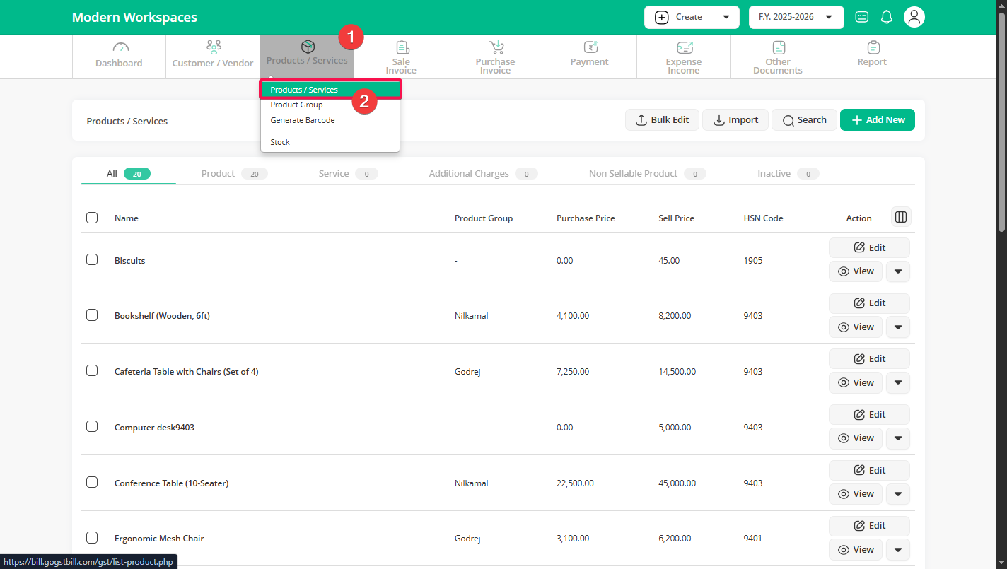 Step 1: Click on the “Product / Services” menu, then select the “Product / Services” sub-menu to access your product list.