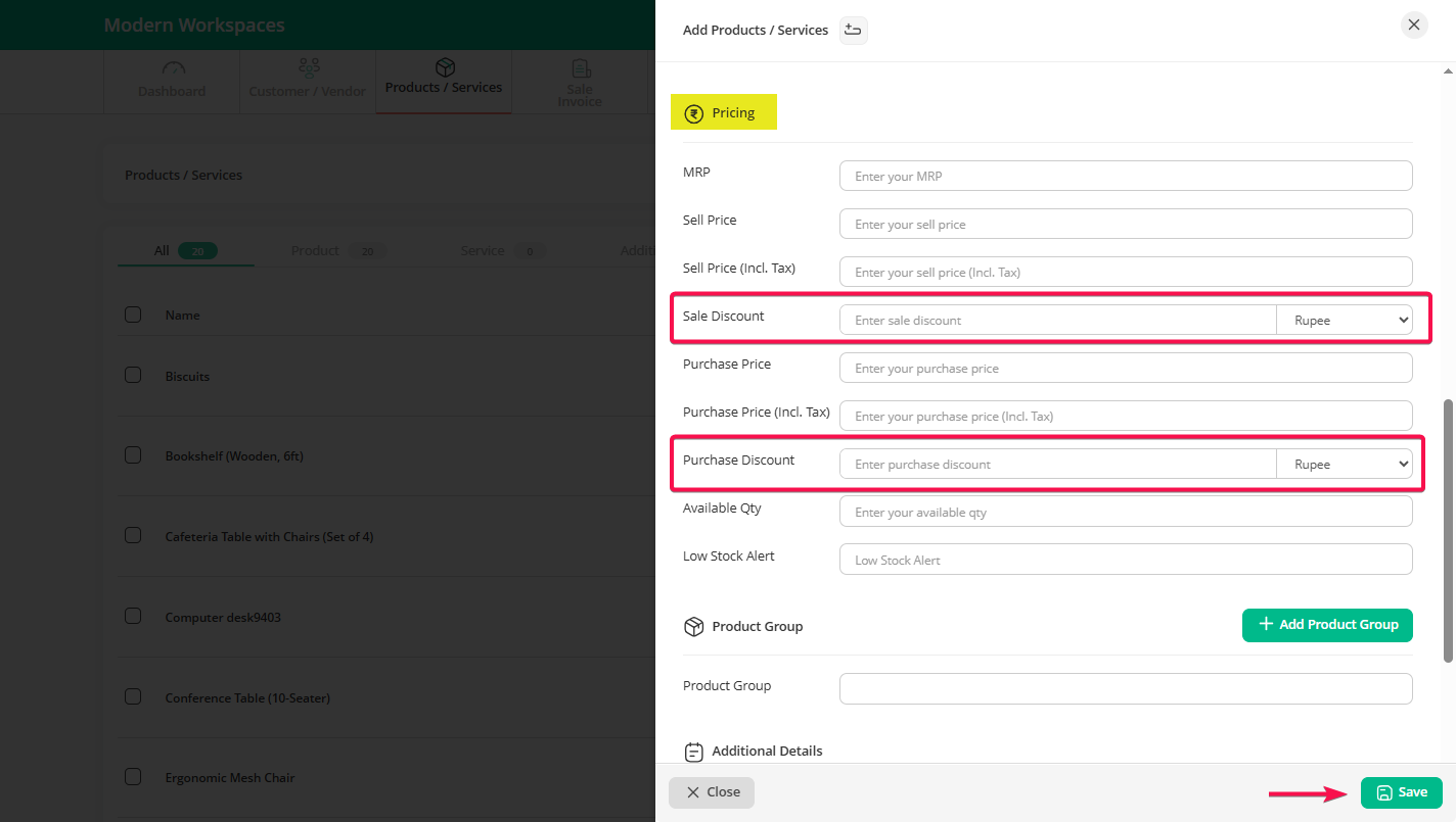 Step 3: In the “Pricing” section, we now have two discount options – “Sale Discount” and “Purchase Discount”.