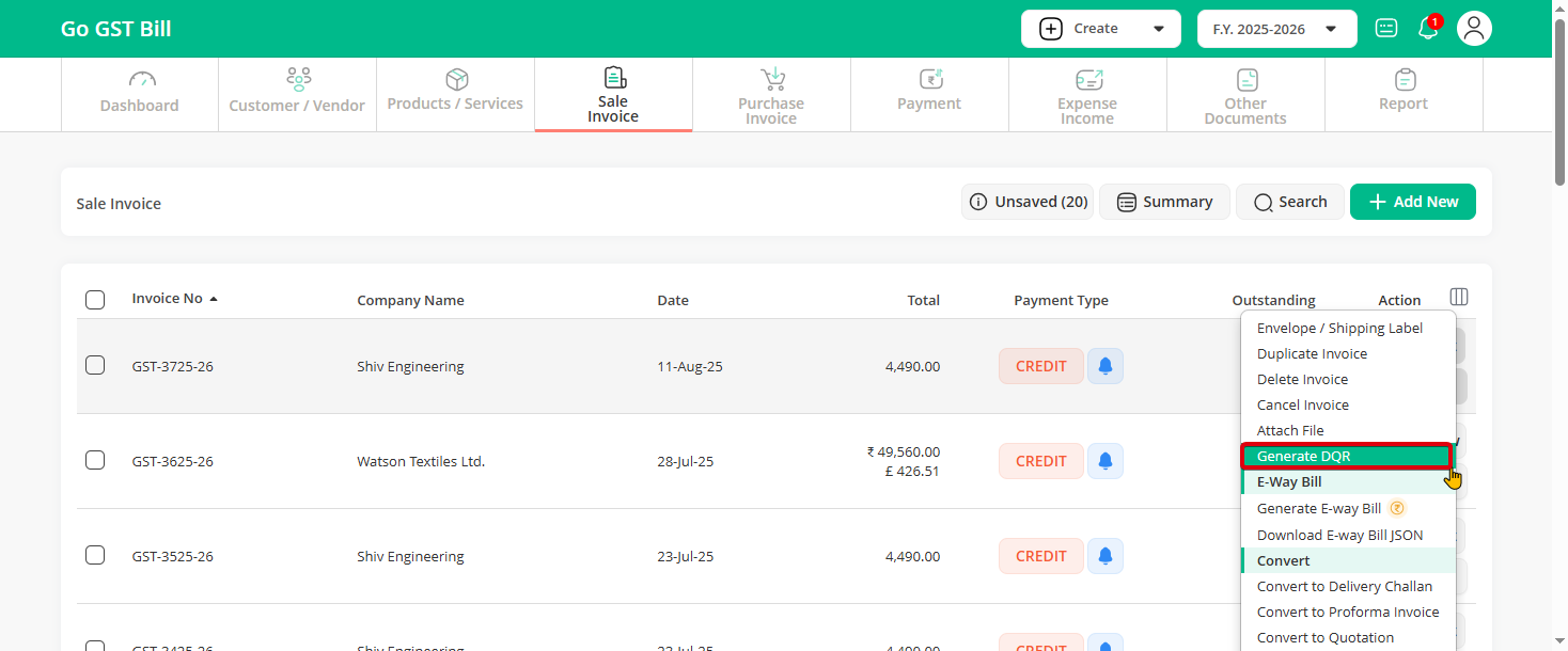 Step 5: Open any Sales Invoice, click on the down arrow, and select “Generate DQR”.