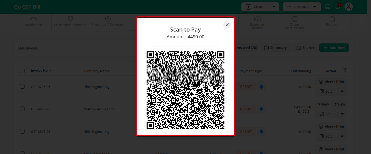 Note: Once a customer makes a payment using this QR, the payment entry will be created automatically in Go GST Bill.